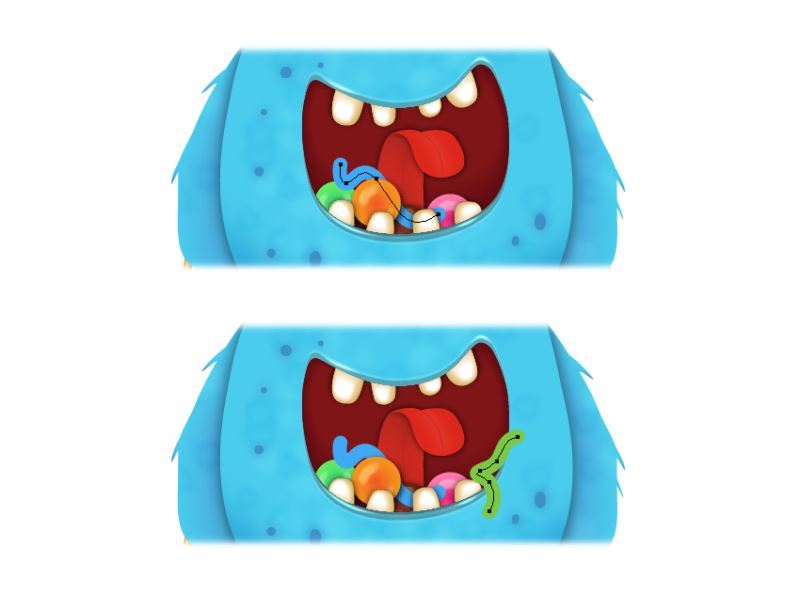 使用钢笔工具(P)在五颜六色的糖果和嘴巴右侧的糖果之间绘制一条波浪形路径。使用您选择的颜色给他们10点行程。