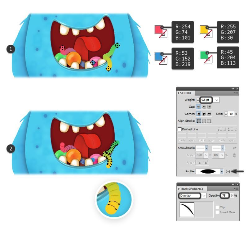 现在,选择组成黄色/绿色蠕虫的所有形状以及嘴巴副本,然后转到对象>剪贴蒙版>制作(对照-7)(2)。结果并不是我们想要的,所以你需要稍微扭曲一下面具的形状来揭示蠕虫的前端(3)。