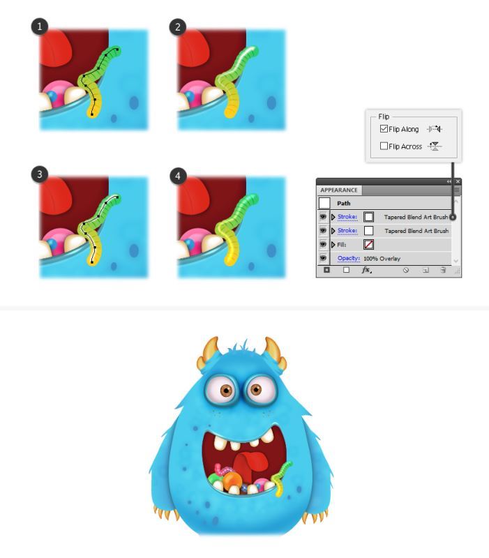 要添加光泽,请在其形状(1)上绘制黄色/绿色果冻蠕虫的路径。给它一个1 pt的白色笔画,并使用Tapered Blend Art Brush(2)。选中此路径后,在"外观"面板中复制现有的"描边"属性,但打开"描边选项"窗口并选中"沿翻转"选项(3)。将混合模式设置为覆盖(4)。