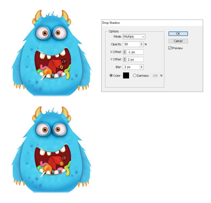 只选择混合的黄色/绿色蠕虫(没有线条和高亮),然后选择复制并粘贴回来(控制-B)复制并展开它(对象>展开)。使用显示的设置(1)将阴影效果应用于结果组。为其他果冻蠕虫重复同样的事情。