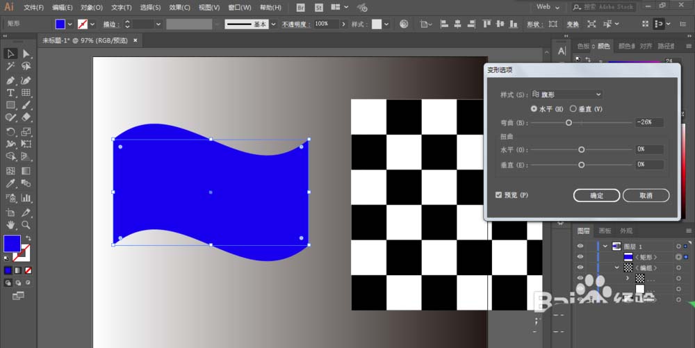 5、矩形工具绘制长方形,进行变形-旗形,扩张一下外观,封套扭曲-用顶层对象建立。