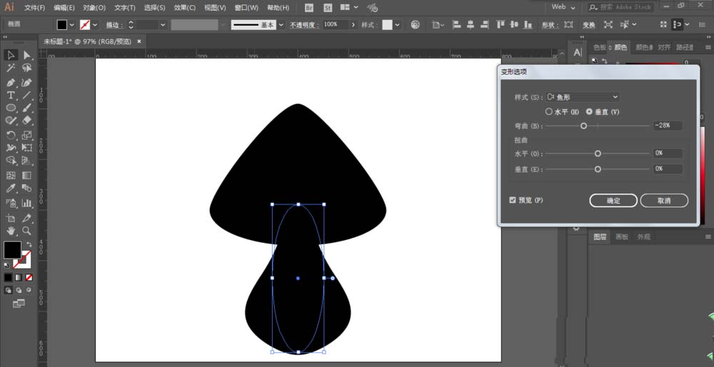 3、再绘制一个椭圆形在下方,进行弧形变形以及鱼形变形。