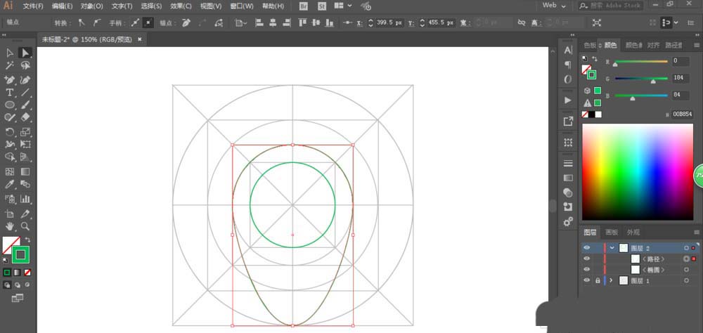 4、调整网格的不透明度后,用椭圆工具绘制2个圆形,然后用直接选择工具选中下方锚点拖动位置,再修改一下转折点。