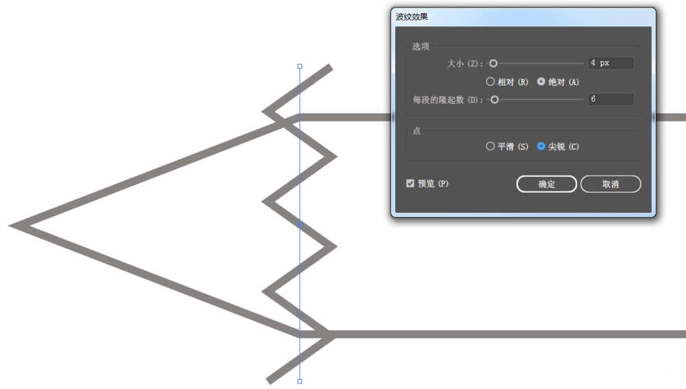 5、退出轮廓视图,选中直线【效果】-【扭曲和变换】-【波纹效果】,在弹出面板上调整参数