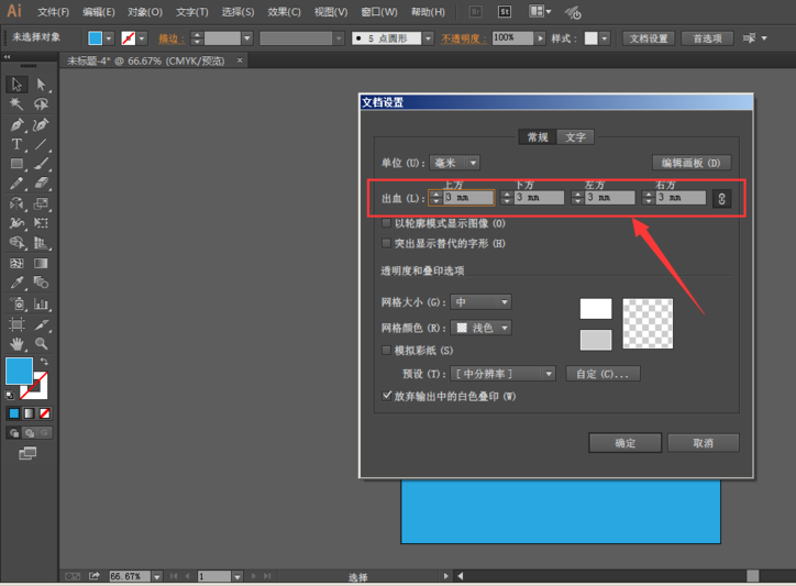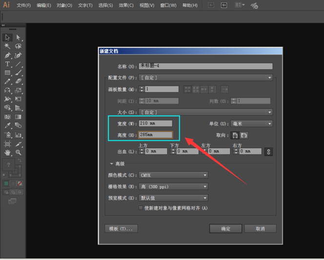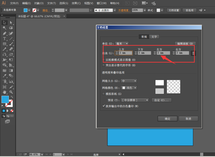 2、在设置文档中,可以调节出血线,出血线一般设置为3mm。设置好出血线后,点击确定。可以看到在画布中四周出现3mm出血线。