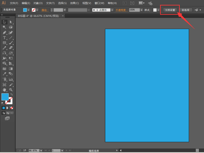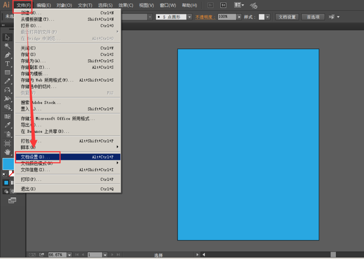 1、如果在属性栏中未找到文档设置,就需要自己去找,打开文件-文档设置。