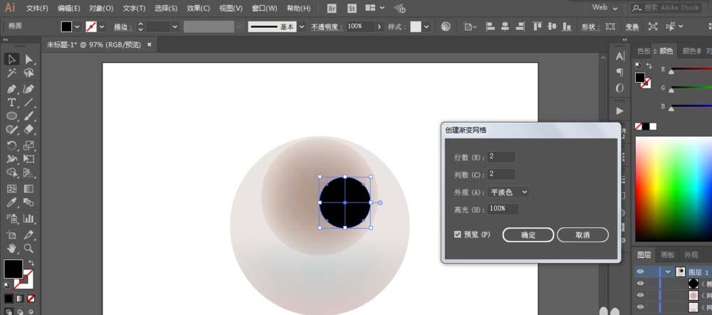 2、用椭圆工具绘制一个圆形,填充颜色,对象-创建渐变网格,调整行列数。
