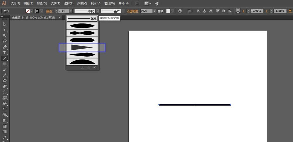 1、这里以AI默认宽度配置文件4为例,选择它可以使线段一头粗,另一头细。那么这里有一个疑问就是怎么改变它的方向,使线段的粗细两端调换过来呢?