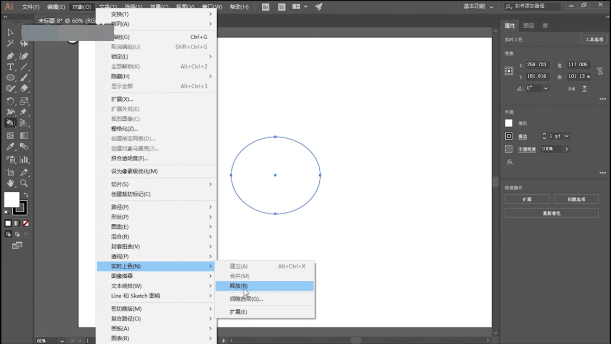 4、在软件上方“对象”一栏中找到“实时上色”,点击“释放”即可。