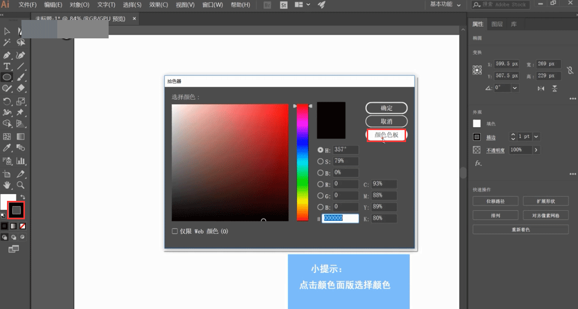 2、鼠标左键双击工具栏中的“描边”按钮,会弹出“拾色器”窗口,点击“拾色器”窗口中的“颜色色板”。