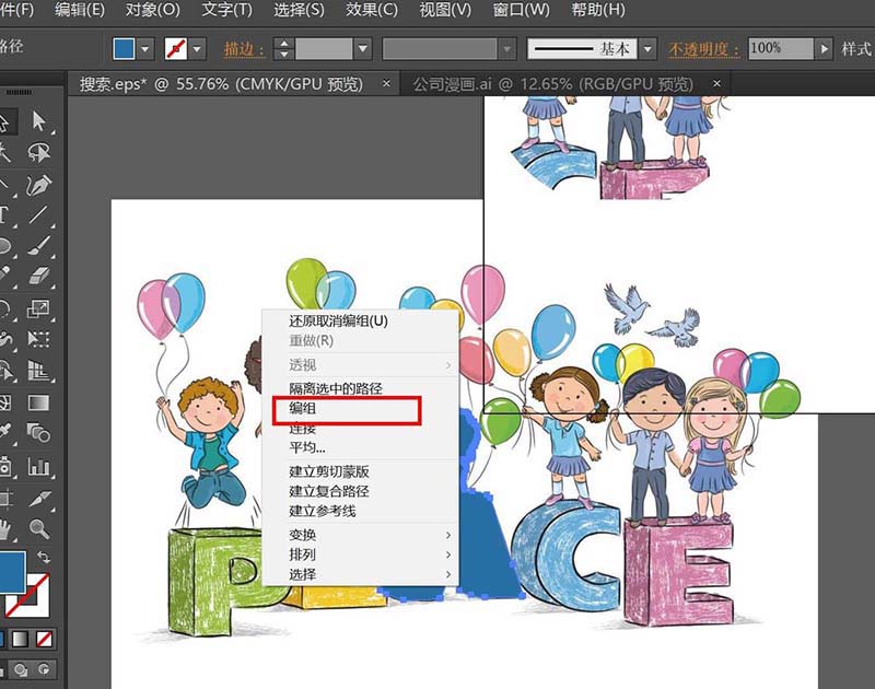 3、建立好后,可以选择填充,然后打组,一定要大组,这才是关键。选中素材与勾出的图形,选择工具框选,右键-建立剪切蒙版。