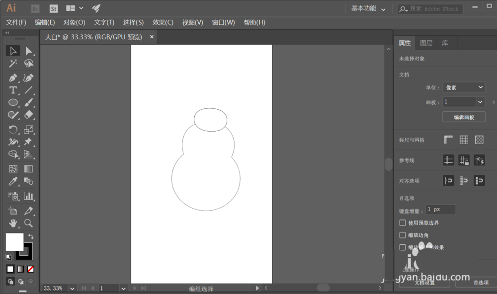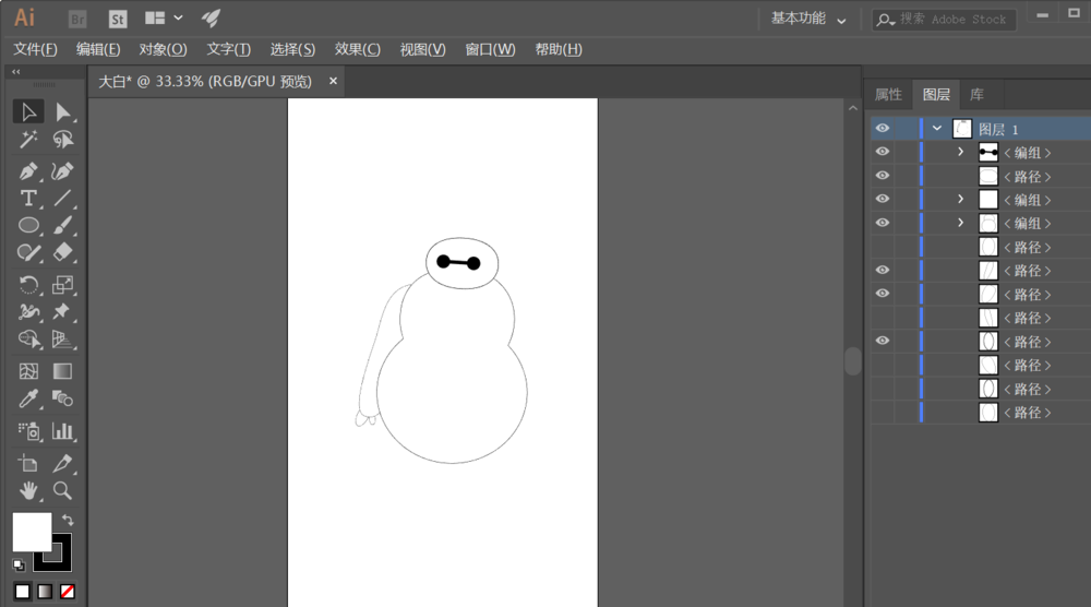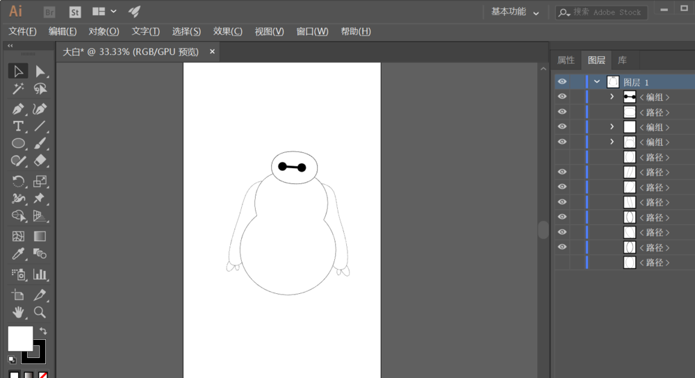 1、打开AI软件,新建一个画板,大小随意。然后用椭圆工具画两个不规则的圆(颜色填充为白色,描边为黑色)作为大白的身子。