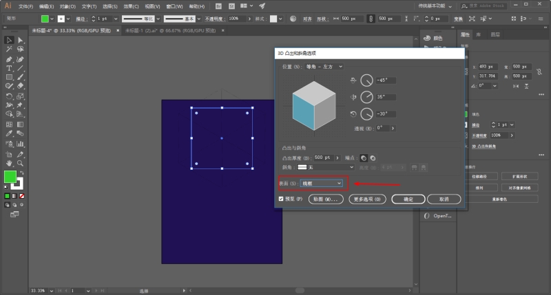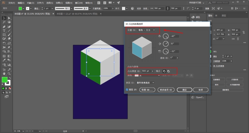 执行效果-3D-凸出和斜角,凸出的厚度大家看着来,只要看起来差不多是个正方体就行。然后位置的话只要是等角都可以: