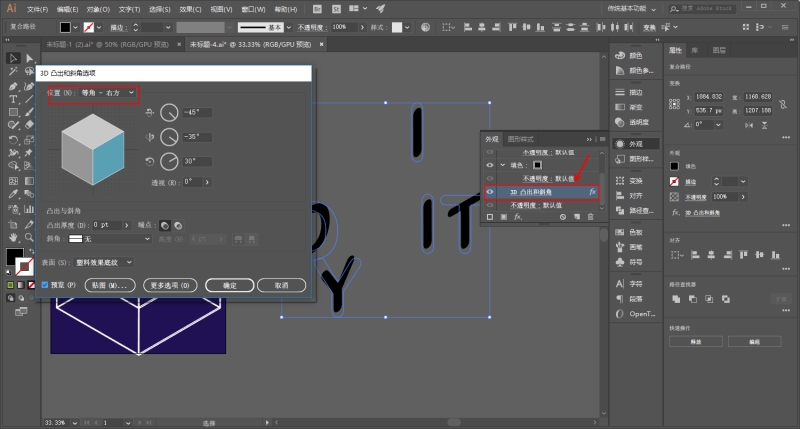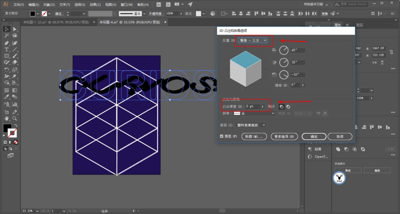 再将文字全部选中,执行效果-3D-凸出和斜角,把位置先改为等角-上方,厚度改为0: