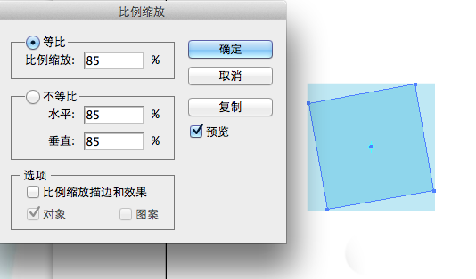 3、选中这个复制出的正方形,右键对话框,变换-缩放-确定