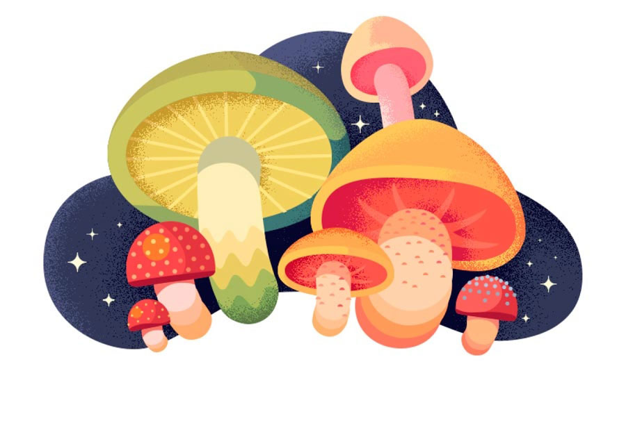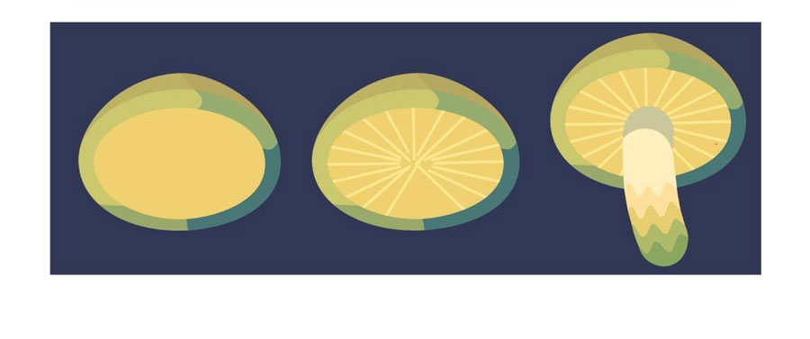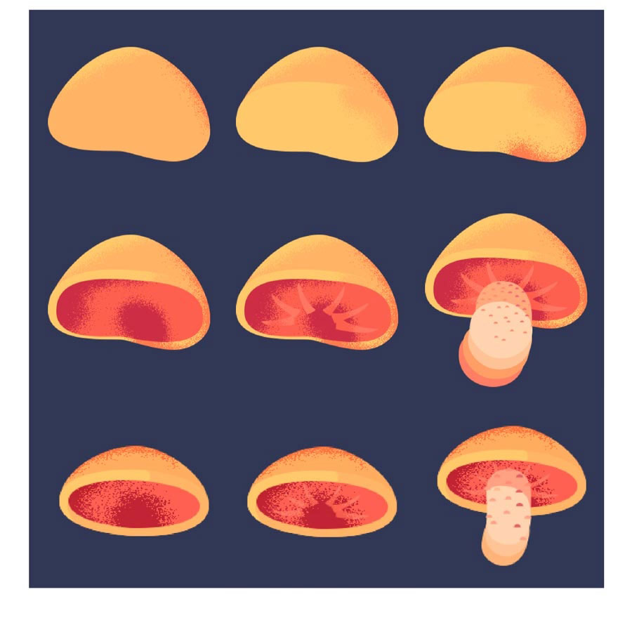 本次教程内容是来自Anano Miminoshvili 的作品,我非常欣赏她对蘑菇的设计和颗粒的处理,在这幅插画中,作者用色彩和颗粒刻画蘑菇的立体感,用不同颜色的圆滑形状叠加成俏皮可爱的蘑菇,用几种不同的蘑菇形象组合成一副整体的插画。通过本次教程我们将了解如何用单一的物体构造成一幅不单一的插画。大家在临摹的时候要注意思考和学习,把别人的思路收入囊中。
