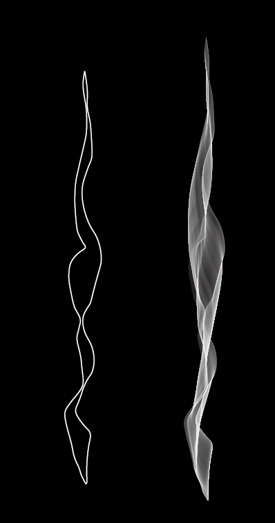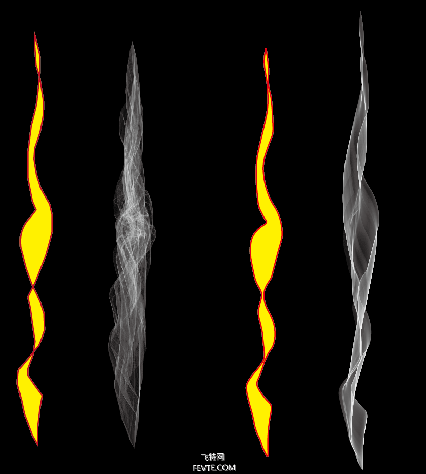 这里我们需要注意,你绘制的形状的圆滑度以及是否交叉会决定封套出来的烟雾形状。示意如下,左边用钢笔工具勾勒,不够圆滑且图形有交叉。右边形状较圆滑且是封闭的图形。