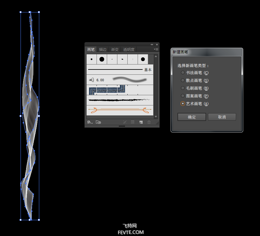 之后我们选择你画出来的烟雾形状新建艺术画笔(可能没画好,就不知道自己弄出来的是什么鬼,这个要多次调整,描边的多少稀疏以及形状的大小扭曲圆滑都会影响最终效果)