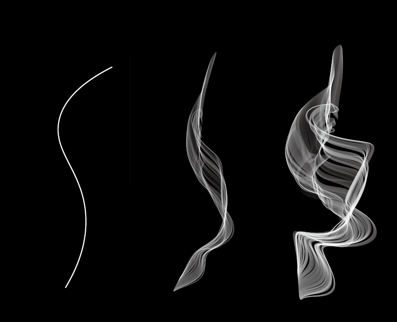 随意画几条曲线,选色我们新建的笔触,这里强调一下,描边大小可以决定烟雾大小和形态,光靠形状调整是不行的。