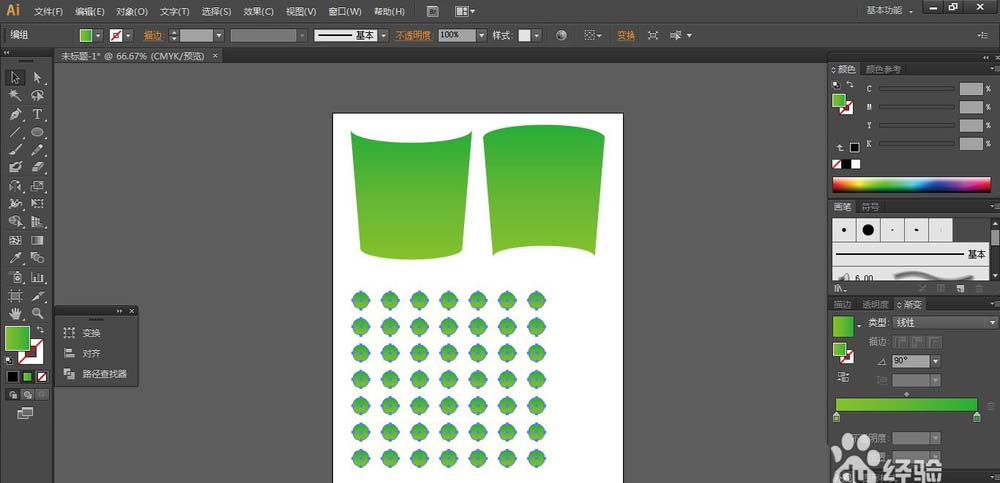 8、选择两个圆形,执行对象-扩展外观,将圆和上面的图形分别居中对齐,调整圆的整体大小,分别执行效果-路径查找器-减去顶层。