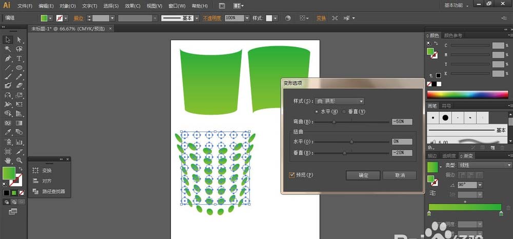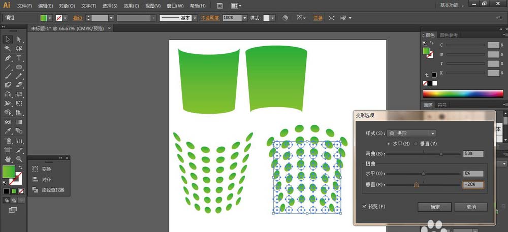 6、将所有圆群组,执行效果-变形-拱形。参数设置如下: