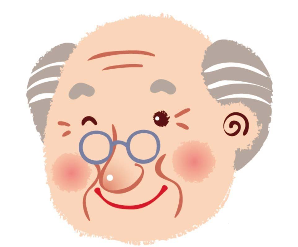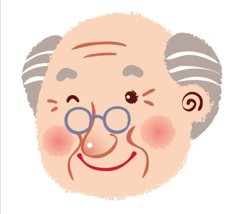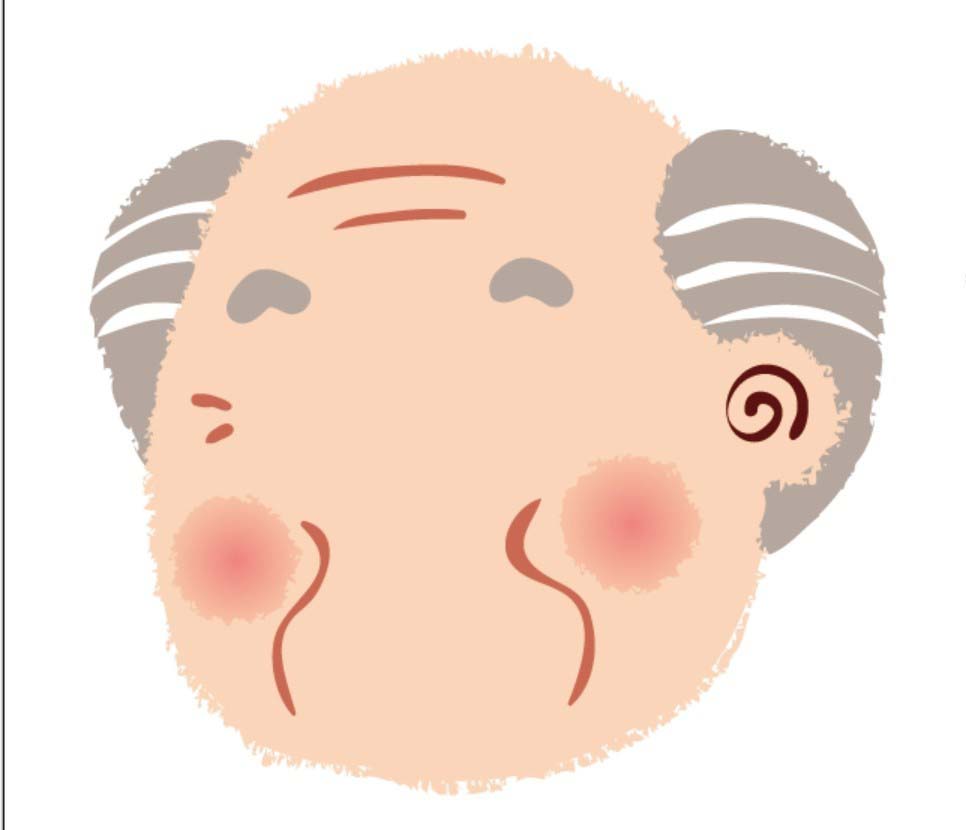 5、用粉红的渐变填充老人左右脸上的圆形脸晕,用灰黑色填充老人的眉毛,用褐色填充老人的耳朵内层与皱纹。
