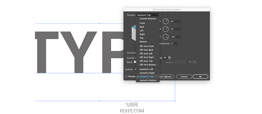 在"凸出和斜角"选项中,修改位置为"等角-上方",角度分别为45°、35°、-30°。