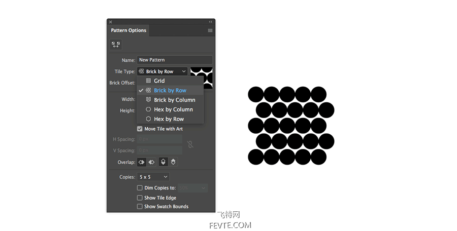 将"拼贴类型"逐块更改为"砖形 (按行)",然后增加"宽度"和"高度"数值(6px)以使点与点之间隔开,距离稍微大一些。 确定