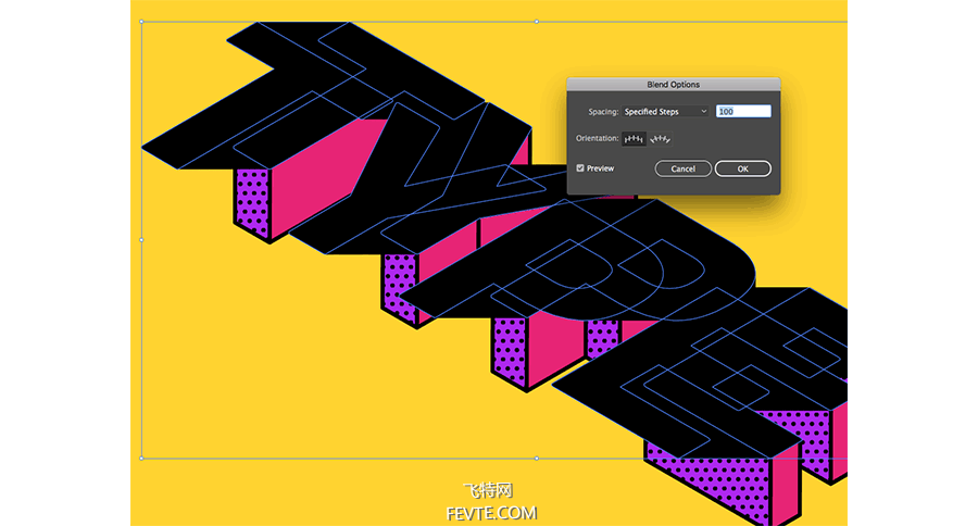 将间距更改为指定的步骤。将值增加到100以在两个形状之间创建平滑过渡,再次选择对象>混合>建立。