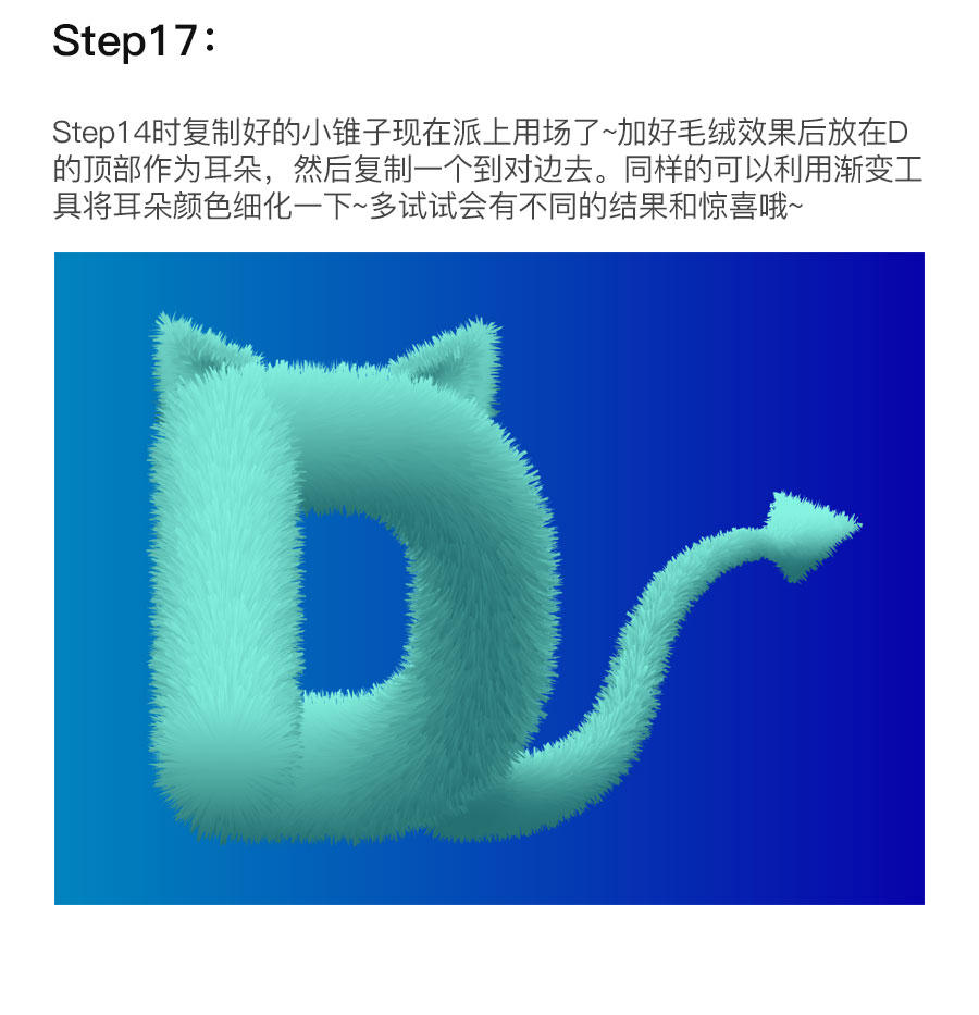 脚本之家的朋友们,大家好!这篇教程教各位Illustrator教程学习者如何使用AI制作一个毛绒绒的3d字母——D,教程打造的毛绒字体是浅蓝色,还带着一只小尾巴和两个小耳朵,像一只小猫咪,非常可爱,教程讲解的很详细,步骤清晰,感兴趣的朋友可以跟着制作一个哦!