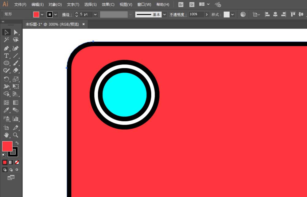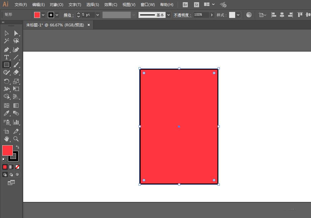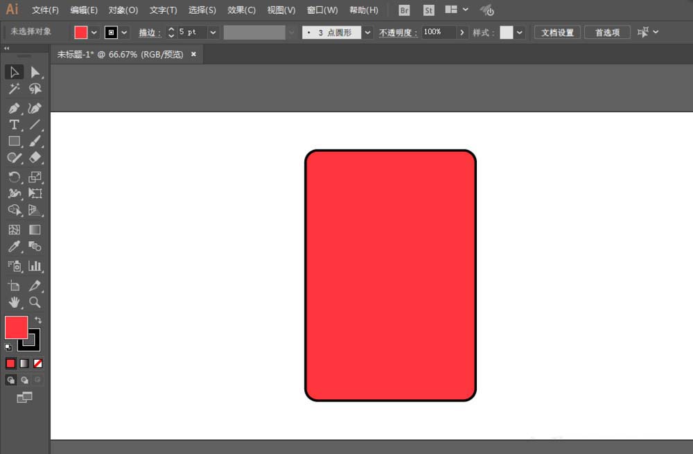 1、新建一个文件,用矩形工具绘制一个长方形,填充红色,描边黑色。改为圆角矩形。