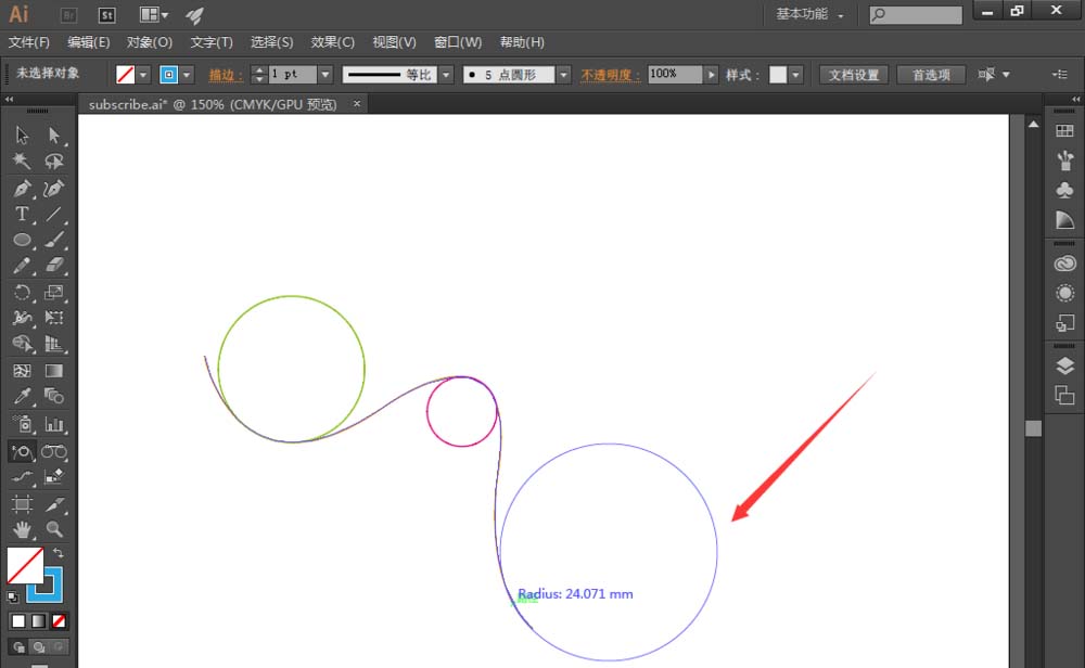 6、用同样的方法,在该弧线的的任意位置上都能绘制出与该弧线相切的圆,即曲率圆,如图。也就是说,通过AI来快速的绘制出曲率圆,是依赖于subscribe插件的【Curvature circle】工具;