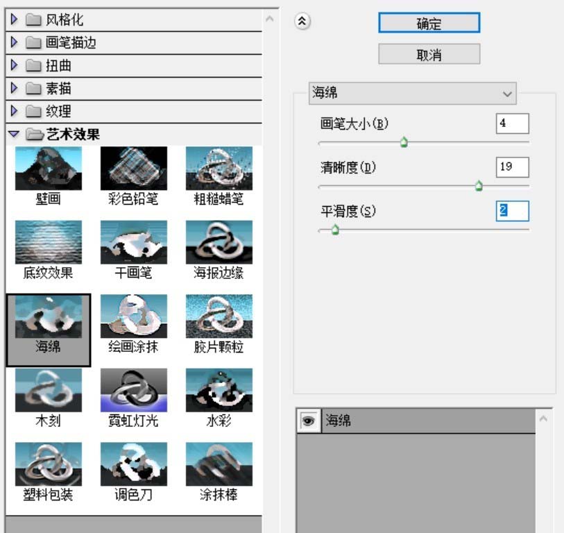 6、我们给所有做好的栅栏做一个艺术效果当中的海绵效果,设置一下参数,从而完成卡通栅栏图片设计。