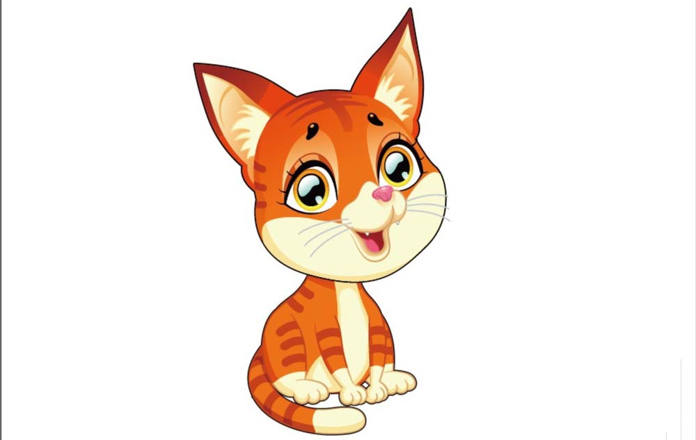 6、用青色的渐变填充小猫的眼晴的亮区,用橙黄色的渐变填充小猫的眼珠部分,眼白用白色填充,眉毛都是黑色填充,完成动漫小猫图片设计。