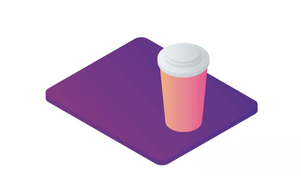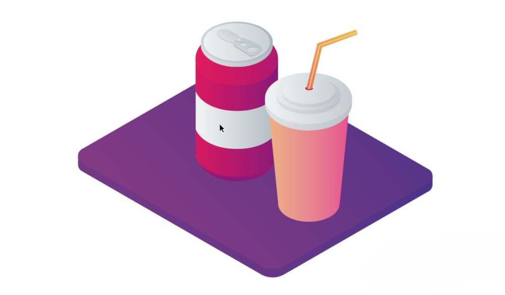 4、用紫色的渐变填充餐盘,用橙红色的渐变填充塑料杯的杯身,用灰白色的渐变填充盖子的不同层次,不同的渐变色调从而让盖子的细节呈现出来。