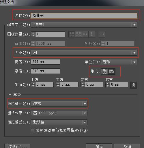 在文件中选择新建画板,常用到的几个选项设置已经给大家标注出来了。