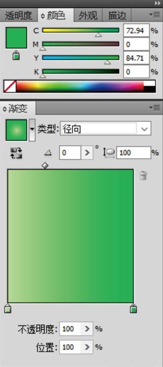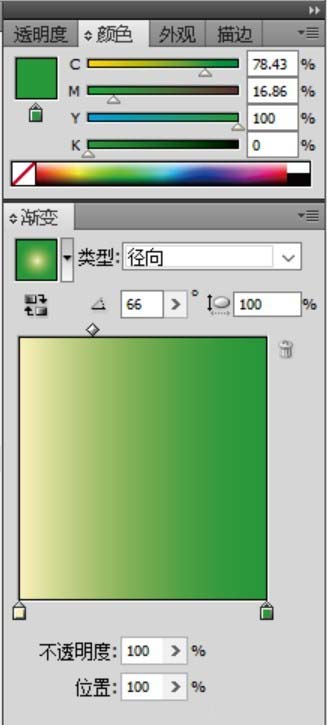 4、用绿色的渐变填充梨子顶端的两小片的叶子路径。