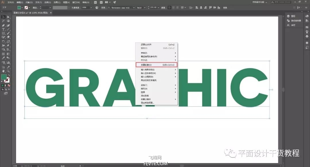 选中文字,右键选择"创建轮廓"命令,将文字转化为对象,便于我们后面的操作。转化为对象之后的文字就不能像原来一样可以使用文字工具再进行编辑了。