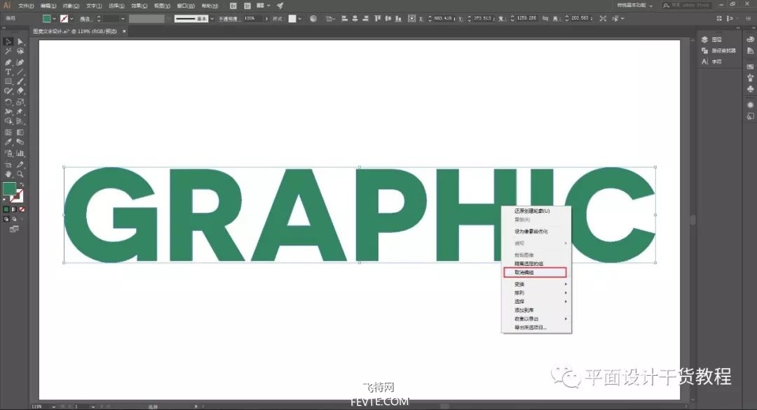 接着对对象进行取消编组,同样右键,选择"取消编组"命令,这样文字就分解成了单独的字母对象,不再是编组的一个整体了,可以单独对每个字母进行编辑操作。接下来我们需要对每个字母进行分割处理了,以便将文字的一部分设计成图案。