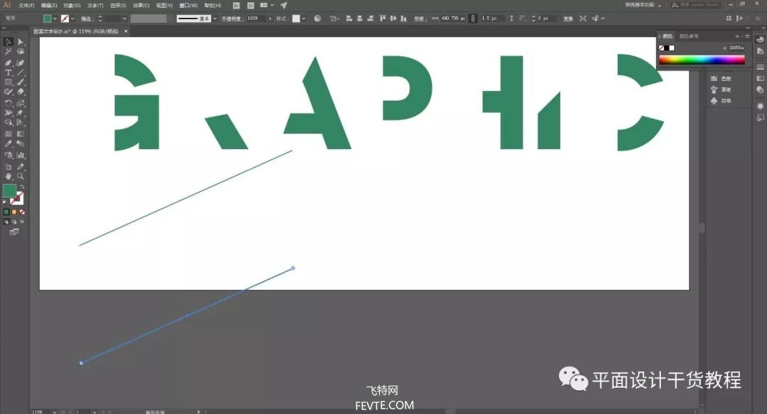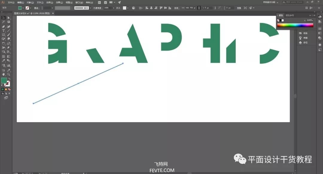选择"直线段工具",沿着字母G如图边缘线的中心点按住Shift+Alt键从中心点向外等比例拖动绘制出直线,这条直线是用来分割字母的,