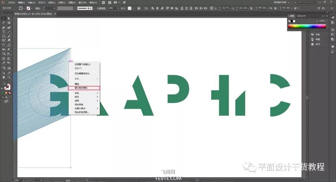 接着同时选中G字母的左边无填充色部分和它下面的混合对象(这里注意不要选中了多余的部分比如不需要变成图案的文字部分),右键选择"建立剪切蒙板",