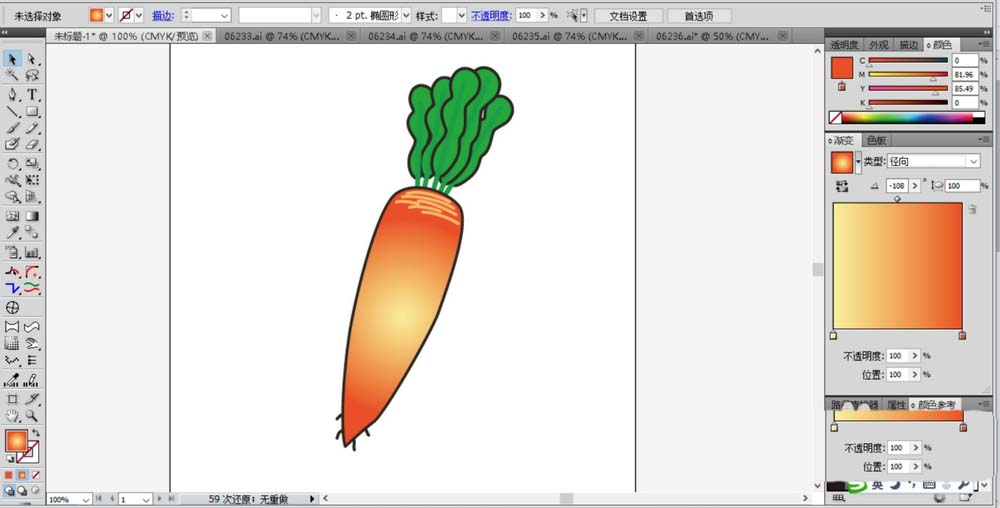 6、下面,我们再用橙色的渐变填充萝卜的主体,这样的胡萝卜在色调上更有层次的变化与逼真的观感。这个渐变是径向渐变,我们可以尝试更多不同的渐变色来填充完成萝卜简笔画设计。