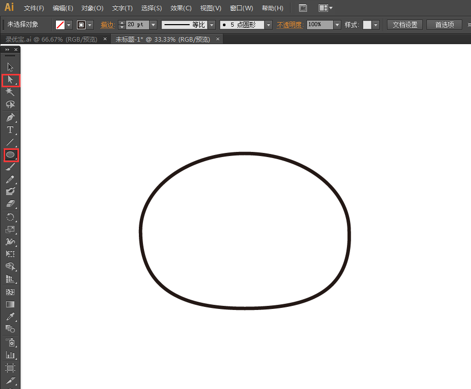 1、打开AI软件,新建画板,使用工具栏中的椭圆工具画出一个椭圆,并用直接选择工具选中节点调整形状。