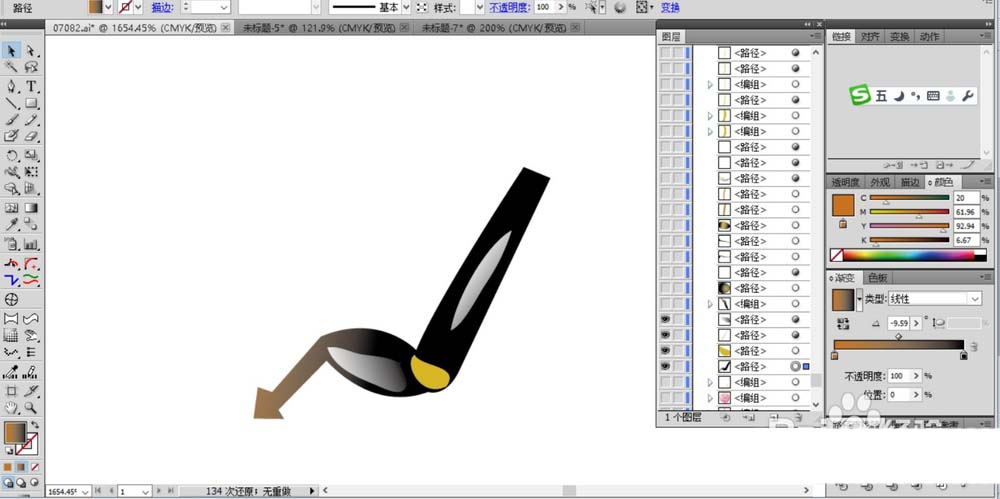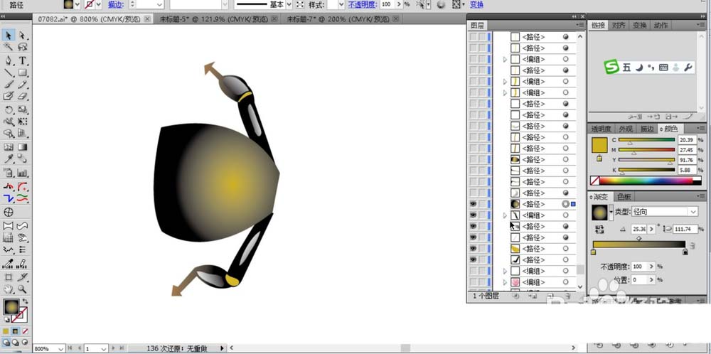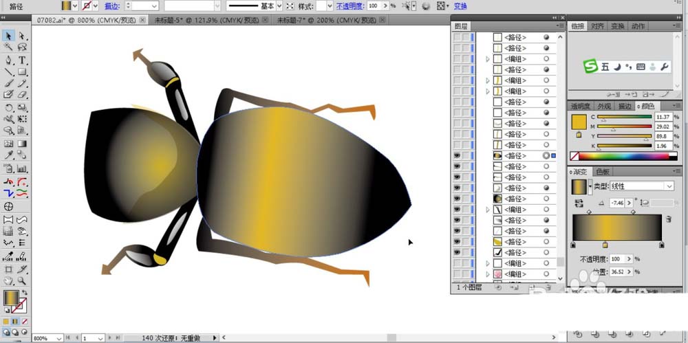 2、我们有了一只脚可以复制出身体另外一侧的蜜蜂脚,再画出蜜蜂身体的圆弧路径同样用黑色到黄色的渐变填充。