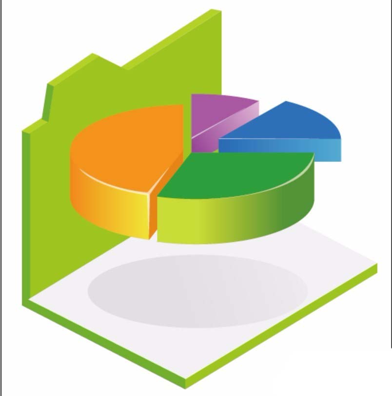6、用蓝色的渐变、绿色的渐变、橙色的渐变、粉色的渐变填充饼状图的四块不同的区域,从而完成饼状图配色设计。