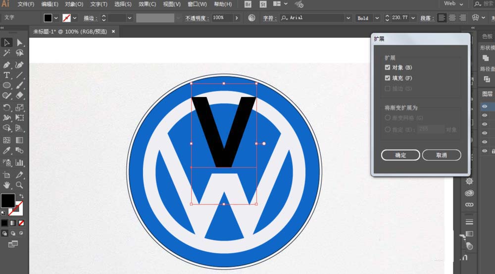 2、文字工具写出W英文字母,扩展对象。