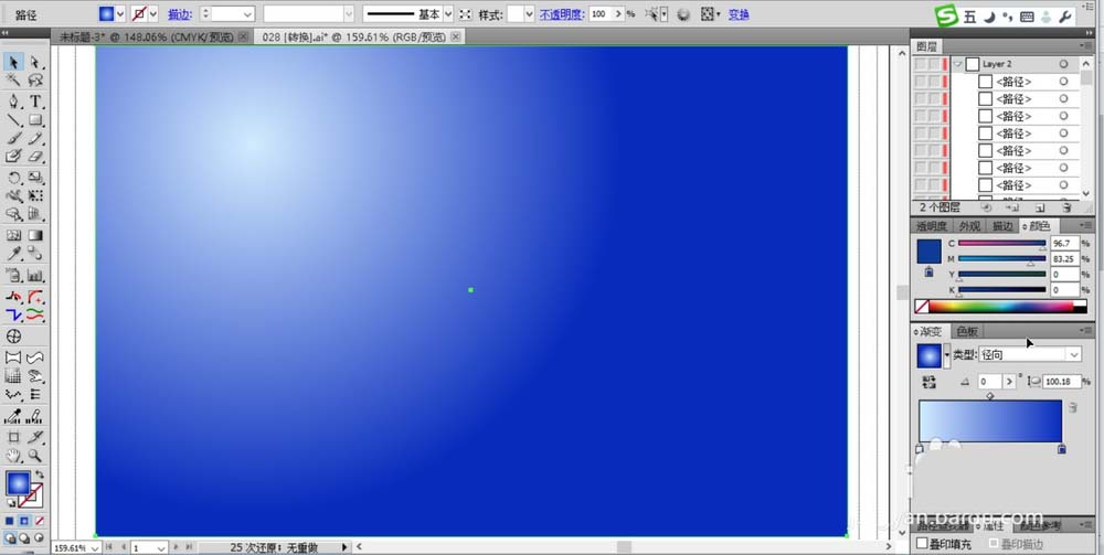 1、设置蓝色的渐变填充天空的四边形的路径,我们把渐变设置为径向渐变。