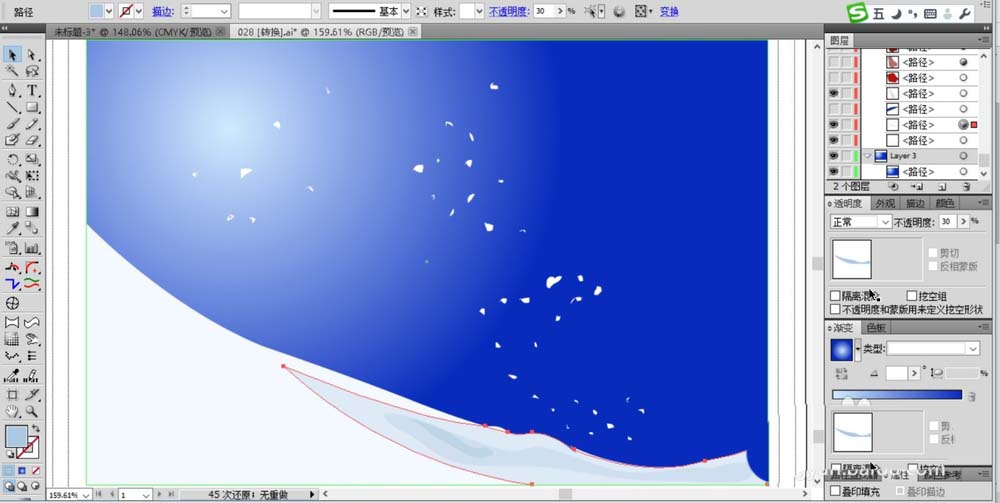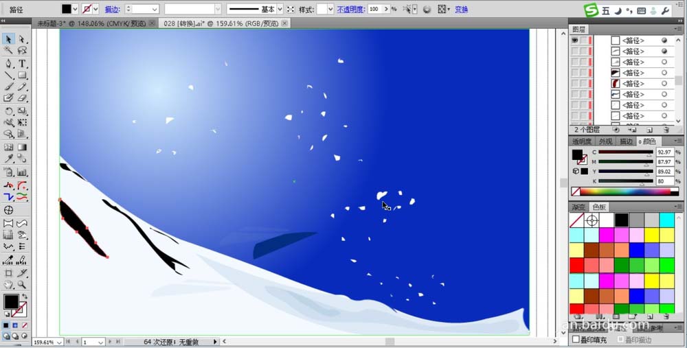 2、继续用钢笔画出雪地的路径,在雪地上面画出山峰的合影路径,在天空上画出很多细小的雪花路径。雪地填充为灰白色,阴影填充为淡蓝色,雪花填充为白色。