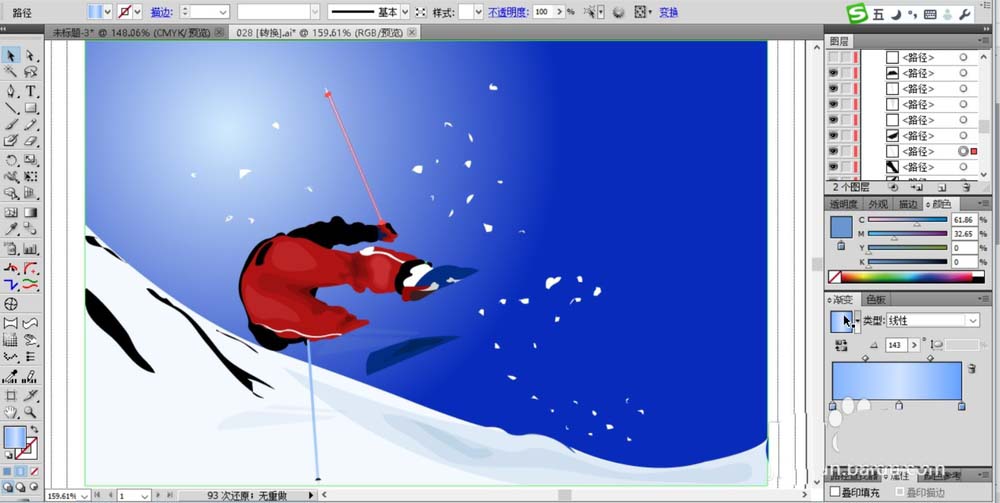 5、继续画出运动的滑雪杆路径并填充一个天蓝色的渐变。