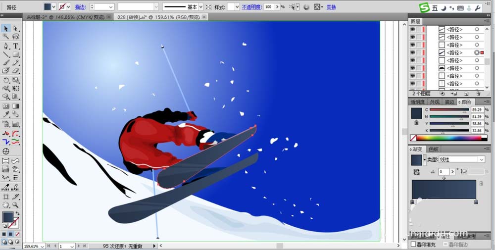 6、画出运动员的滑雪板的路径,并填充一个灰黑色的渐变,完成滑雪运动图片设计。